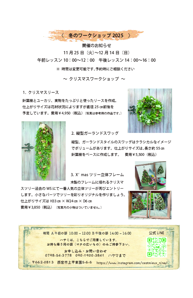 12月には、リース・スワッグ・オーナメント、クリスマスお正月ワークショップも行います。